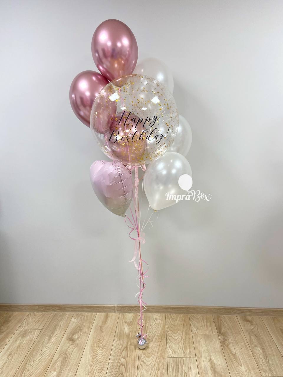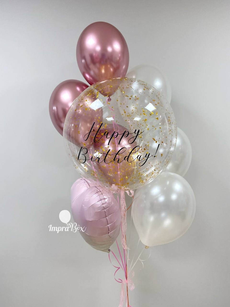 - efektowny przezroczysty balon bubbles z z konfetti w środku i napisem personalizowanym w zestawie balonów lateksowych 6 szt + serce foliowe